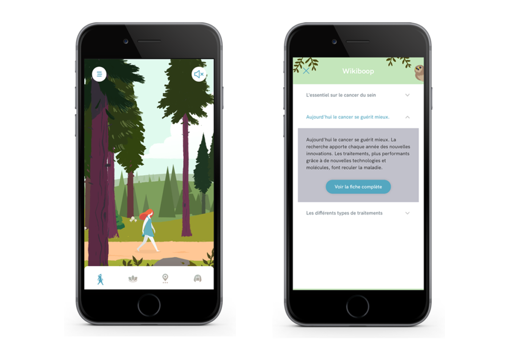 Dans la même veine que les applications de bien-être et de développement personnel, Wikiboop est une application gamifiée dont la conception douce et bienveillante s’appuie sur les codes et best practices du jeu vidéo pour rendre les patientes actrices dans la prise en charge de leur maladie. L’objectif est de leur permettre de mieux appréhender et préparer leur parcours de soin et leurs traitements.