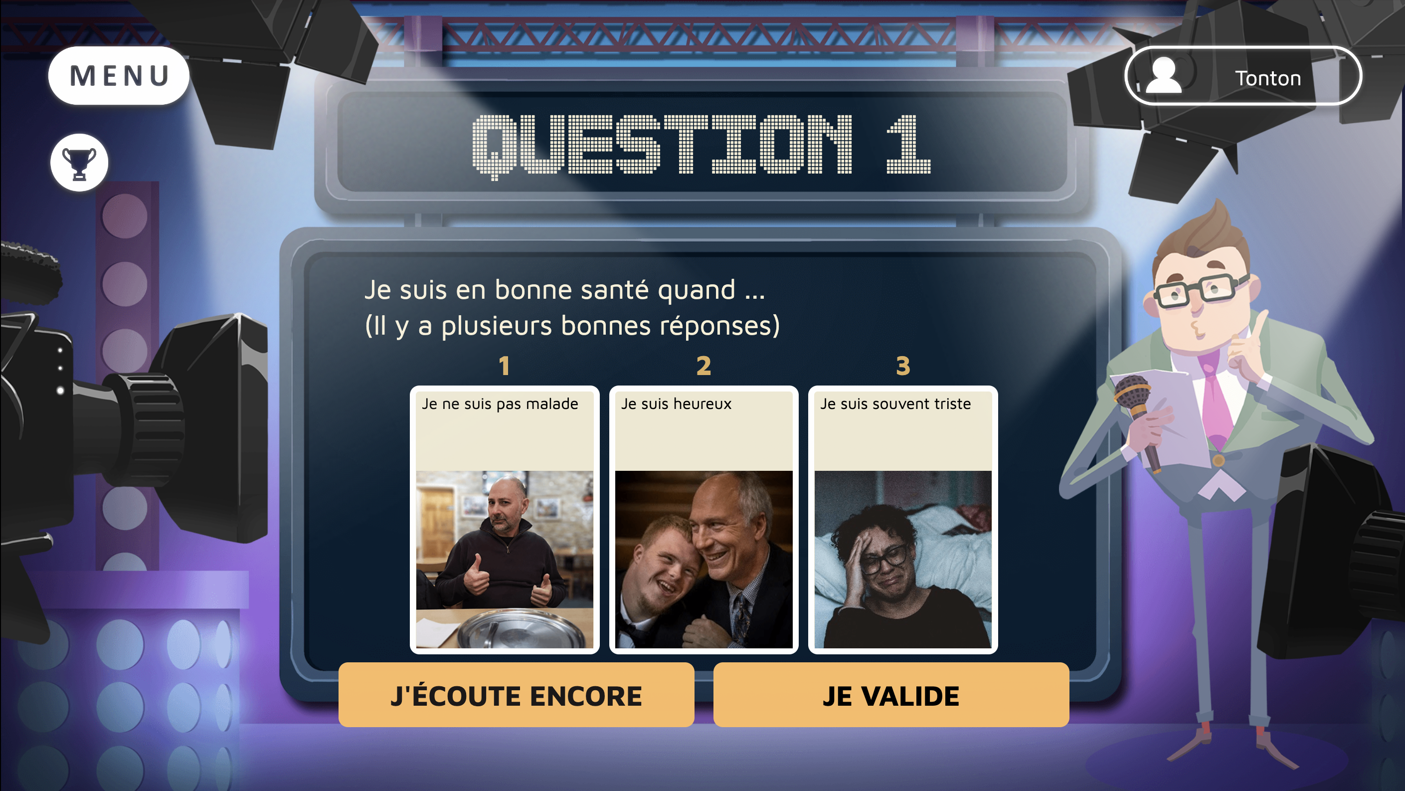 Le jeu est basé sur une mécanique classique, simple mais toujours ludique, y compris pour un large public : le quiz. Nous avons conçu celui-ci sur-mesure avec l’UDAPEI afin qu’il soit parfaitement adapté au public handicapé mental. Pour cela, nous nous sommes appuyé sur un univers bien connu de tous, tout en permettant un certain dépaysement : le jeu télé !