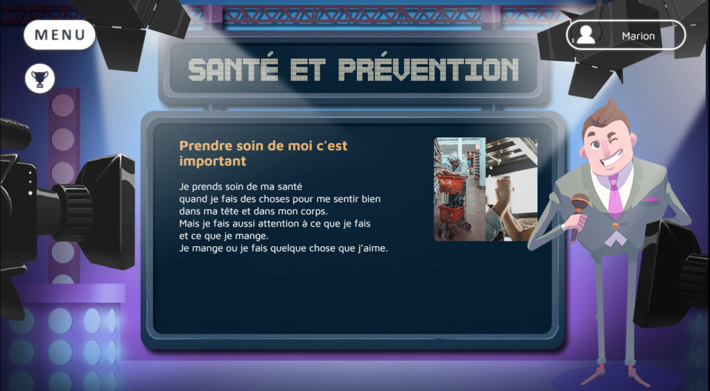 Quiz Santé est un serious game de sensibilisation à destination des personnes en situation de handicap mental dont l’objectif est de diffuser des messages de promotion de la santé orientés prévention cancer et hygiène de vie. Sa particularité est d’être entièrement réalisé en F.A.L.C. (Facile à Lire et à Comprendre) et propose ainsi une accessibilité optimale pour ce type de public.